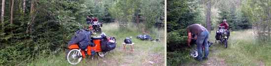 Nach ca. 10 Km Abfahrt und 2-3 gescheiterten Versuchen, hatte ich Glück und fand dicht an der Straße ein verschwiegenes abgelegenes Wäldchen mit einem verwachsenen Holzabfahrtweg. Genau das was wir suchten.