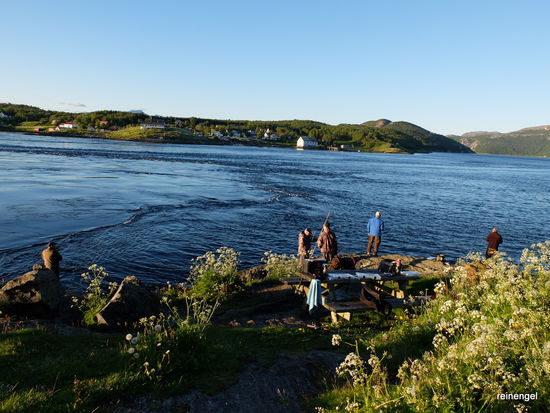 Die gewaltigen Kräfte des Saltstraumen bei Bodø lassen sich hier nur erahnen. Wir haben auf der gegenüberliegenden Seite direkt am steilen Ufer übernachtet. Von dort konnten die unheimlichen Wasserwirbel und Strudel direkt und hautnah beobachtet werden. Anscheinend sind die Fische so durcheinandergewirbelt, dass sie unvorsichtigerweise gerne in die Haken der vielen Angler beißen, die überall vom Ufer aus ihre Köder auswerfen. Vielleicht freuten sie sich auch nur über die zurückgekehrte Sonne.