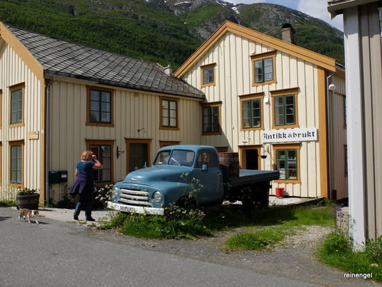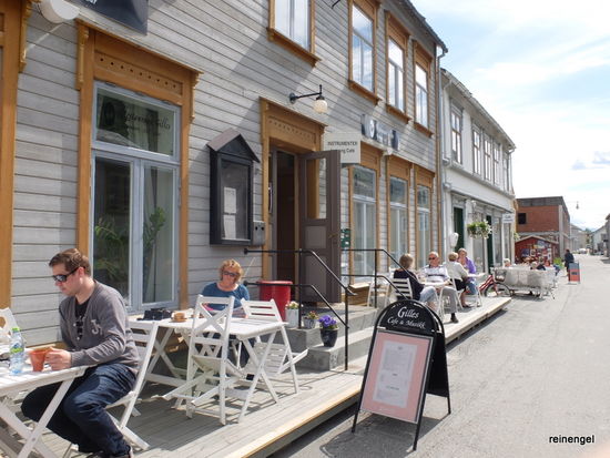 Im Städtchen Mosjoen bleiben wir hängen, erstens weil wir einkaufen wollen, weil wir zweitens die warme Sonne verspüren und weil wir drittens die kleine aber original erhaltene gepflegte Altstadt entdecken. Der erste Freiluftkaffee seit langem vor typischem Holzhaus.