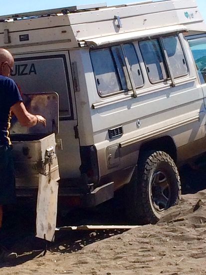 Bevor ich den Stellplatz beziehe, möchte ich unbedingt zur Aufzuchtstation von Schildkröten fahren, nichts wie weg. Irgendwo muss ich wenden und schon ist es passiert - ich fahre etwas unvorsichtig zu weit in den Sand um zu wenden - und bereits ist für Schlamassel gesorgt.