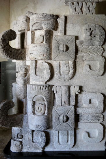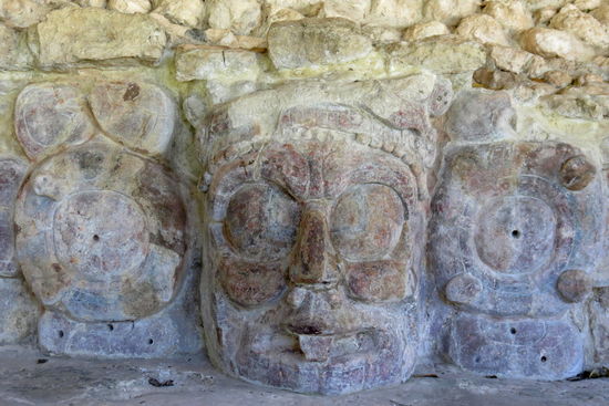 65 Stufen führen hinauf auf die oberste der fünf Stockwerke. Die verschiedenen Ebenen wurden von Masken-, Schlangen- und Jaguarköpfen verziert. Sie sind heute zu ihrem Schutz vor Verwitterung in einer Palapa untergebracht. Dies war der wichtigste Tempel von Edzna