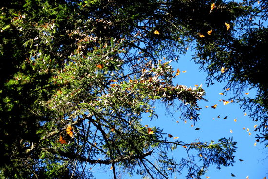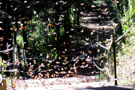 Es ist eines der atemberaubensten Naturschauspiele, die Wanderung der Monarchfalter durch ganz Nordamerika. Jedes Jahr fliegen zwischen 30 und 100 Millionen dieser prachtvollen Schmetterlinge ca. 4000 km von Kanada und den USA zu ihrem Winterquartier in Michoacan. Das Naturschutzgebiet Sanctuario de Mariposas Monarca El Rosario liegt nahe dem Städtchen Anguangueo. So gegen Ende Oktober treffen die ersten Schmetterlinge hier ein und überwintern in den Wäldern, welche sie Mitte März jeweils wieder verlassen und in ihr Sommerquartier zurück fliegen.