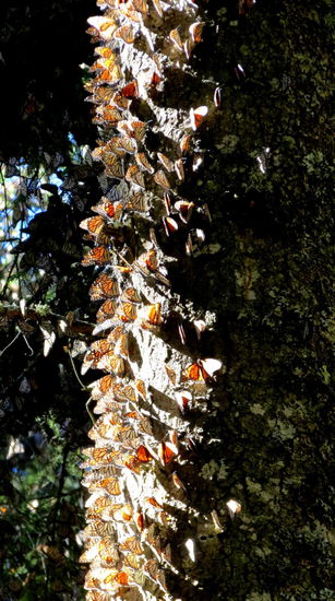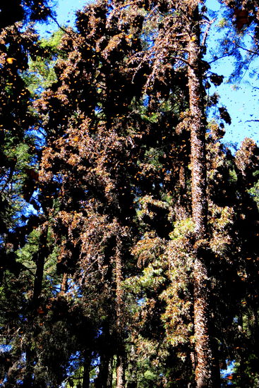 In riesigen "Trauben" hängen die Falter an den Bäumen. Sie haben ein Wechselsystem entwickelt, da aussen immer die tiefsten Temperaturen herrschen! Die Falter sind ständig in Bewegung und zwar von aussen nach innen, da die Innentemperaturen sie überleben lässt.