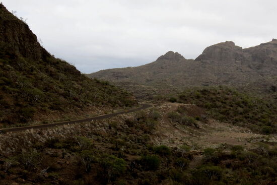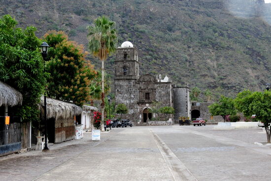 Leider beginnt es am vereinbarten Tag zu regnen, auch ist es sehr windig. Wir verzichten deshalb auf die Wale Watching Tour und fahren weiter. Auch auf den Besuch eines Campings direkt an einer Bahia lassen wir - aus dem gleichen Grund - sausen. Als kleinen Ersatz fahren wir zur Mision San Javier. Es ist ein wundervolles Hochtal, welches entlang einem kleinen Fluss führt.