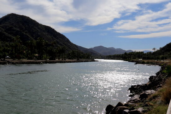 Wir bleiben eine Nacht auf dem Camping Huerta Don Chano. Der Spaziergang in den Ort Mulegé führt uns an dem Flussufer entlang. Auf der Gegenseite sind neue Häuser im Schutz der Berge entstanden.