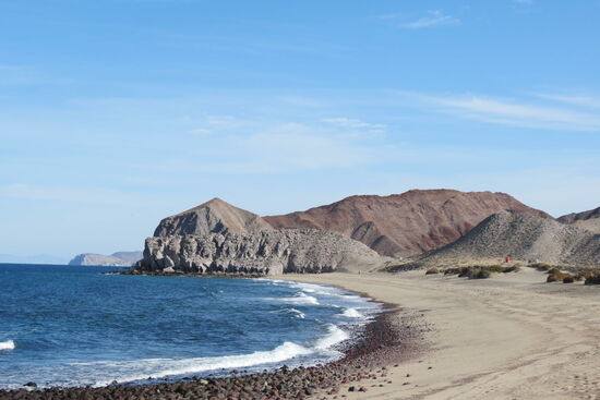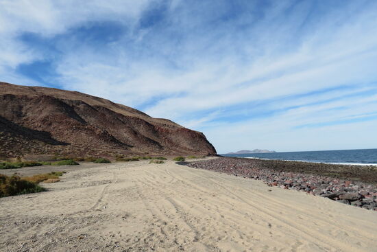 Zeitig fahren wir weg in Guerrero Negro. Wir haben beschlossen, nicht mit der Fähre in Santa Rosalia nach Guymas rüber zu setzen, sondern di e Baja bis nach Mexicali an der US-Grenze zu umrunden. Nach 230 km - nach mehreren Militärkontrollen - landen wir bei Papa Fernandez - einem kleinen Campingplatz hinter Hügeln versteckt! Die Einfahrt ist bestens bewacht durch drei angekettete Hunde. Die Einhundert Pesos bezahle ich sehr gerne, der Platz selber liegt wirklich hinter Hügeln, direkt am Strand. Leider - auch das darf ich mal sagen - die Mexikaner haben es nicht so mit dem Abfall, da würde eine "grüne Bewegung" mal echt gut tun. Wie schon an andern Orten sammle ich vrerst Unrat ein- meistens sind es Bierdosen, mal Schuhe oder die zu oft gebrauchte Plasticsäcke…, aber auch Dosen von Campern, welche achtlos ins Feuer geworfen wurde. Der Strand ist steinig aber sehr schön.