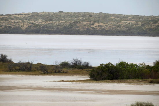 Die Strasse führt über einen Damm durch die trockene Wüste. Die Salzreste auf beiden Seiten der Strasse lassen erahnen, dass bei stürmischer See das Wasser bis zur oder sogar über die Strasse geschwemmt wird.