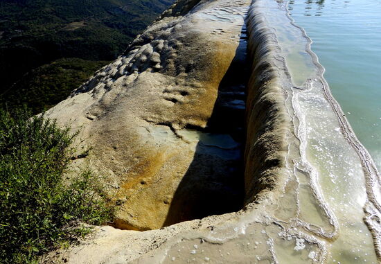 Hierve de Agua besteht aus einer Serie von Wasserfällen, welche sich durch ihre weisse Farbe und der beeindruckenden Höhe von gegen 30 m auszeichnen. Sie sind vor Tausenden von Jahren durch den Abfluss von kohlensäurehaltigem Wasser entstanden. Diese mineralische Ablage, wenn sich krustenförmige Überzüge bilden, nennt sich Sinter.