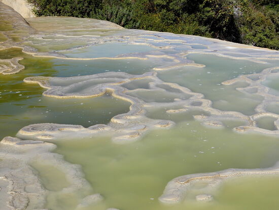 Die kohlensäurehaltigen Wasser wurden bereits vor 2000 Jahren zur Bewässerung der Felder kanalisiert. Man könnte hier auch stundenlang durch die schönen Berge wandern. Ein Besuch zum Fusse des versteinerten Wasserfalls lohnt sich ebenfalls.