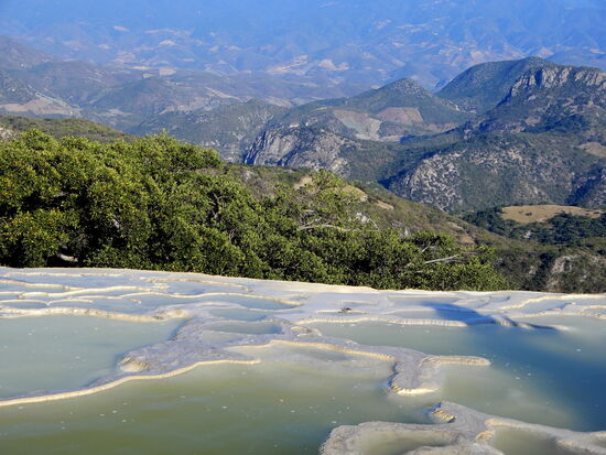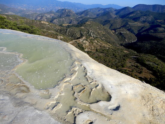 Rund 70 km ausserhalb Oaxaca liegt der versteinerte Wasserfall Hierve de Agua. Es ist ein Wunder der Natur und eine der schönsten natürlichen Attraktionen Oaxacas. Die Becken mit natürlichem Mineralwasser ermöglichen einen tollen Badespass. Der Panoramablick in die interessante Berrgwelt Oaxacas mit seiner vielfältigen Vegetation ist ebenso atemberaubend - und das direkt vom Beckenrand gesehen!
