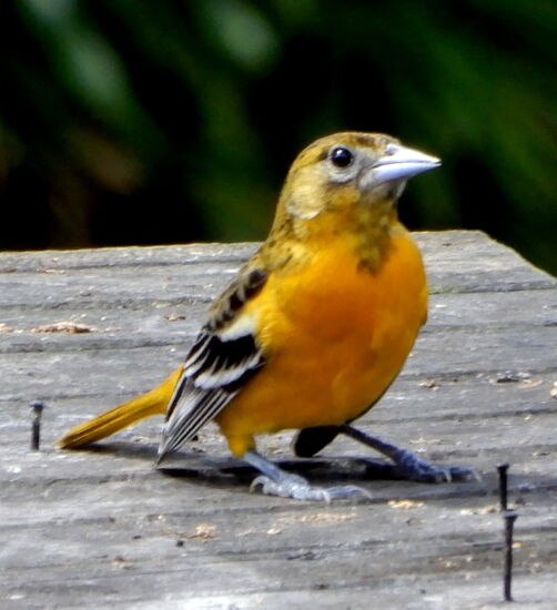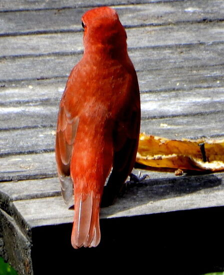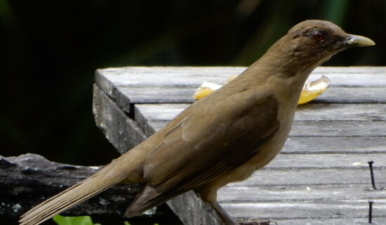 Keine Pause gibt es auf dem Vogelbrett! Ein paar geschnittene Bananen hingelegt, und schon stürzt sich eine grosse Vogelschar auf die süsse Speise!