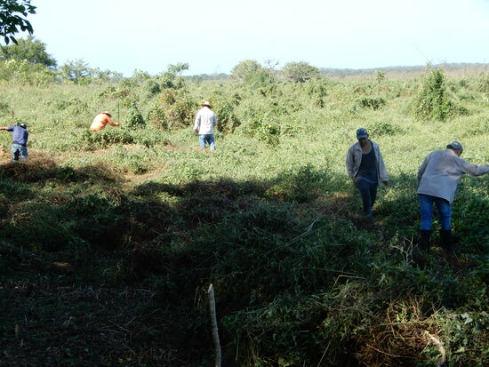 Wir gehen (schwitzend, es ist sehr, sehr heiss - gefühlte 40 °C!!) zur ersten Gruppe von Arbeitern, welche die Pflanzungen von den Überwucherungen wieder frei macht.