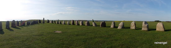 Direkt hinterm Ort auf einem Aussichtshügel vor der Küste liegt ein Steinkreis aus ganz früher Zeit (Ale stenar), der gar nicht so leicht zu finden ist. Mindestens so beeindruckend wie das englische Original. Wir können es total genießen, denn wir sind die einzigen Besucher heute.