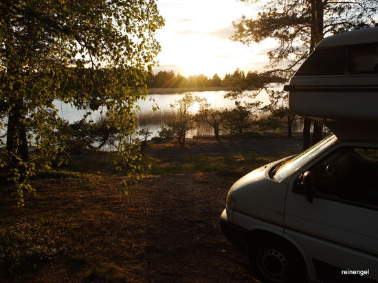 Auch unser einsamer ruhiger Übernachtungsplatz bei Furuby bietet einen schönen Sandstrand. Das flache Gewässer ist schon noch kalt, aber zum Abkühlen gerade richtig.