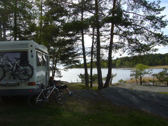 Man glaubt es nicht. Sogar hier, nicht weit weg von Karlstad am Vänern, findet man diese idyllischen Plätzchen mit allem Komfort. Toilettenhäuschen, stabile Bestuhlung und Ausblick von den glatten Schärenfelsen inbegriffen.