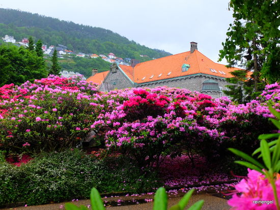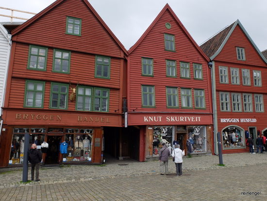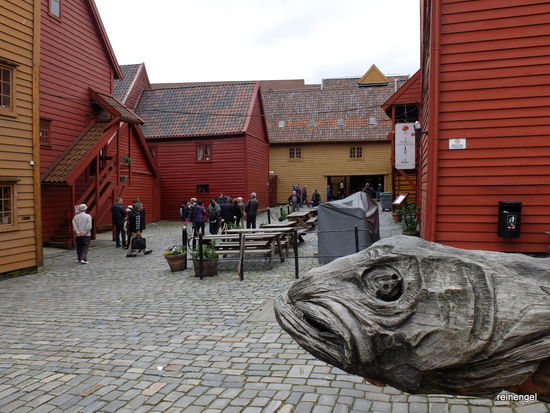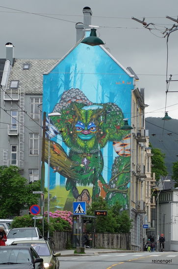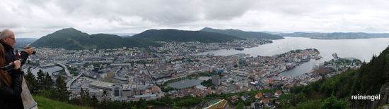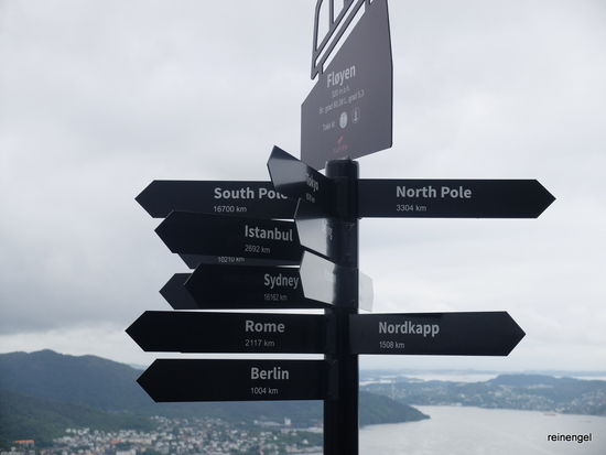 Da wir schon am frühen Mittag in Bergen eintreffen, finden wir problemlos einen offiziellen Stellplatz mit Strom- und Straßenbahnanschluss. Die Bahn bringt uns schnell und problemlos direkt ins Zentrum. Und hier ist echt was los. Viele Kreuzfahrer und sonst irgendwie Hergereiste und natürlich auch Einheimische und Studenten tummeln sich bei den Einkaufstempeln der Innenstadt und am Hafen mit der berühmten Skyline der Bryggenholzhäuser. Genau dort ist das dichteste Gedränge. Das zweitdichteste ist oben am Hausberg, dem Fløyen oder Fløyberg. Dies ist einer der sieben Berge der Stadt und verständlicherweise eine sehr beliebte Touristenattraktion. Das Bergplateau liegt auf einer Höhe von 399 m direkt oberhalb des Stadtzentrums und mit der elektrischen Standseilbahn bequem zu erreichen.