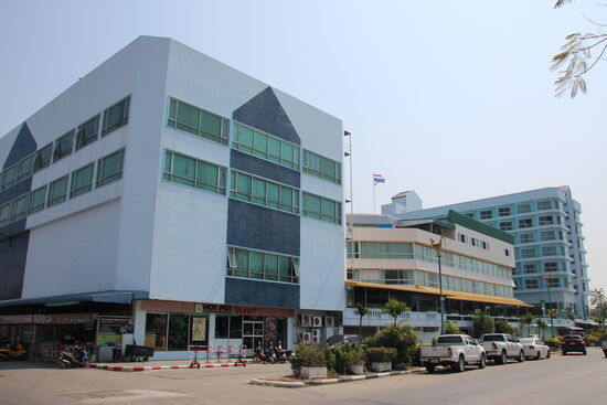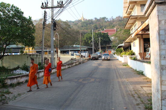 Ich mache mich wieder auf den Weg, die Straße genau vor der Brasserie weg vom See könnte zu dem Hotel führen, das ich ursprünglich im Kopf hatte und bei dem ich bei meiner letzten Reise schon einmal ein Zimmer gebucht hatte. Damals hat aber die Planung nicht funktioniert wie gewollt und ich hatte auch nur eine Übernachtung hier eingeplant, die ich dann schlicht abschreiben musste. Das Hotel kommt tatsächlich nach kurzer Zeit und trotzdem habe ich auf dem kurzen Weg wenigstens 4 oder 5 nette Kneipen gesehen, in denen man bestimmt abends schön etwas trinken gehen kann. Das Hotel selbst sieht ordentlich aus, vielleicht nicht ganz so nobel wie das 42. Dafür hat es ebenfalls einen Pool, liegt wie man sieht ideal zentral und kostet auch noch ein Drittel weniger. Ich halte mich links und laufe die relativ leere Hauptstraße entlang. Gestern schon habe ich aus meinem Tucktuck heraus gesehen, dass hier in der Umgebung wohl auch Songteows herumfahren. Welche Linien die bedienen weiß ich natürlich nicht. Tucktucks sehe ich aber keine.