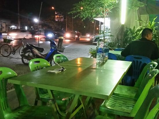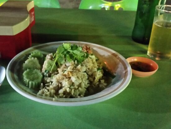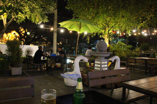 Wie üblich habe ich mich in Internet etwas schlau gemacht über die Umgebung um das Hotel herum und gesehen, dass sich an der Straße in die Stadt gar nicht weit vom Hotel weg eine interessante Kneipe befindet, irgendetwas mit 9 Pints – The Gastro House. Das wäre ja schon einmal nicht schlecht. Die zwei Restaurants in der Gegend, die vielversprechend sind, liegen in einer Straße die vor dem Hotel von der Hauptstraße weg geht. Als ich mich auf den Weg zum Abendessen mache, fragen mich die Damen an der Rezeption, wo ich denn hin möchte. Ich sage, dass ich etwas zum Essen gehen suche. Da meinen sie, die nächsten offenen Lokale seien gleich hier vor dem 7 Eleven. Ich laufe zur Einfahrt raus, halte mich rechts, Richtung Stadt und – nichts. Nach einer Weile taucht die Kneipe auf und sieht auch in der Tat vielversprechend aus. Ich laufe aber erst einmal weiter. Irgendwann denke ich mir, dass etwas nicht stimmen kann. Hier kommt kein 7 Eleven. Nach meiner Erfahrung laufen Thais ungern. Sehr unwahrscheinlich, dass sie mich zu Fuß so weit schicken würden. Außerdem zeigt es mir gleich, wie komplett abseits das Hotel liegt. Nach einer Weile komme ich an zwei typischen Thairestaurants vorbei, die versuchen mit schwingenden Taschenlampen Autofahrer von der Straße in Ihre Lokale zu lenken. Der erste kommt gleich auf mich zugeeilt. Vor seinem Lokal steht ein dunkler Bus und einige junge Soldaten essen hier während die andren wohl auf sie warten. Allerdings gibt es keinerlei englische Karte noch irgendwelche Bilder und englisch sprechen tut natürlich auch niemand. Ich versuche, ob ich an dem Stand, an dem sie kochen etwas zusammensuchen kann. Da kommt der Chef wieder angelaufen und winkt mich zu einer von zwei Kühltruhen. Hier ist verschiedenes an Fleisch, Garnelen und Tintenfisch drin. Ich zeige auf Garnelen und Tintenfisch. Er erzählt irgendetwas, das ich als Pad Thai interpretiere und ich nicke. ES kommt dann stattdessen gebratener Reis mit Garnelen und Tintenfisch, der aber sehr gut schmeckt. Auch mein Chang Bier bekomme ich. Gezahlt habe ich dafür insgesamt 130 B. Da kann man nicht meckern.