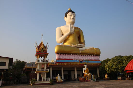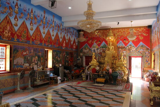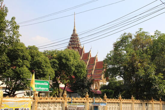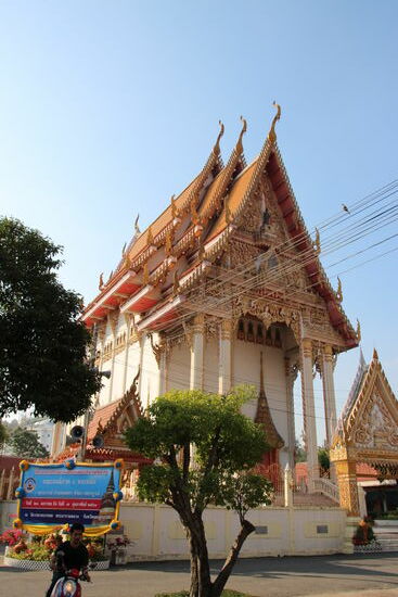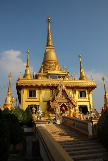 Es dauert eine Weile, bis das Tucktuck dann da ist. Wieder habe ich die Strecke unterschätzt. Vor allem als es dann von der größeren Straße ab, den Berg hoch geht. Die vielen Windungen sind bei Google Maps nicht zu sehen. Mein Fahrer fährt an den Turm vorbei, der mir allerdings auch einen geschlossenen Eindruck macht, und hält etwa 100 Metern vor einem wunderschönen Tempel. An der Rezeption hatte ich gefragt, was die Fahrt kostet. Eines der Mädchen hat gemeint 80 B. Die Zweite hat korrigiert, dass es auch 100 sein können. Die gebe ich dem Fahrer, aber der meint, neenee, das Kostet 150 B. Ich überlege kurz, bedenke, wie lange ich da wohl zu Fuß unterwegs bin, um wieder ins Hotel zu kommen und schlage vor, dass ich ihm noch einmal 100 gebe, wenn er auf mich wartet, und mich dann zurück fährt. Er meint, dass kostet aber 300 und wir einigen uns auf noch einmal 150 B.