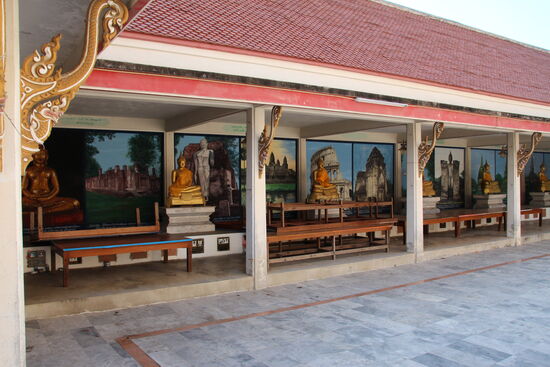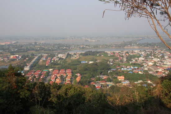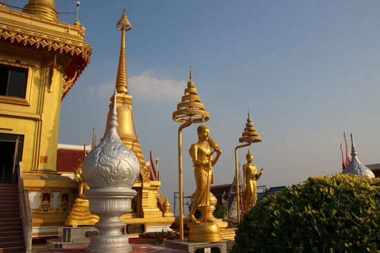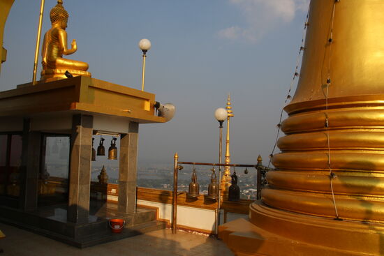 Auf dem Tempelgelände führt eine breite Treppe weiter nach oben auf ein kleines aber feines viereckiges Gebäude zu. Also hoch, Schuhe ausgezogen und in das Gebäude. Dort sitzt ein Mönch, der mir zunickt und von Gesten unterstützt meint, ich solle die Treppe rauf in den 4. Stock. Dort finde ich mich auf einer Terrasse wieder, von der ich einen fantastischen Blick auf Nakhon Sawan habe. Die Uhrzeit habe ich auch gerade richtig erwischt. Die Sonne steht schon tief genug für schöne Fotos. Andererseits wird das Gebäude um 17:00, also gleich, geschlossen.