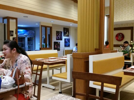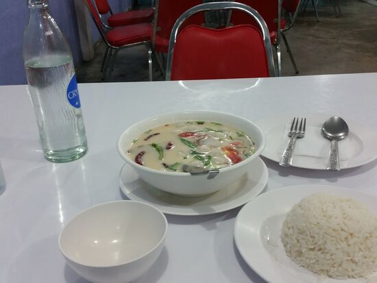 Zum Abendessen mache ich mich heute auf den Weg zu einem der beiden Lokale in der Querstraße, quasi an der Hinter Ausfahrt des Hotels. Es handelt sich um ein „Halal Seafood Restaurant“, das im Internet sehr für seine Essensqualität gelobt wird. Bei Halal handelt es sich um eine besondere Zubereitungsart aus der moslemischen Küche. Das Lokal wirkt sehr kühl, nüchtern ungemütlich aber sauber eingerichtet. Ich freue mich, als ich Jakobsmuscheln mit Spargel auf der Karte sehe. Das ist es doch. Dummerweise dann doch nicht, weil es gerade keine gibt. Alkohol gibt es passenderweise auch keinen. Also nehme ich eine Meeresfrüchtesuppe und gekochten Reis und denke, dass ich die in Thailand typische Vorrichtungen bekomme, in der die Suppe in einer Art Rand um eine beheizte Mitte schwimmt und man sich mit einem Schöpflöffel in sein Schälchen schaufelt. Der Schöpflöffel stimmt zwar, aber sonst kommt einfach nur eine mittelgroße Plastikschüssel. Die Suppe sieht aus wie eine Tom Ka Gai, nur statt Hühnchen mit Meeresfrüchten. Wobei diese sich für meinen Geschmack ziemlich im Rahmen gehalten haben. Die Suppe selbst war als Kokosmilchsuppe mit den üblichen Unmengen an Kräutern und sonstigen Dingen, mit denen man eine Suppe würzen kann mit dem Reis zusammen nicht zu scharf und ganz lecker.