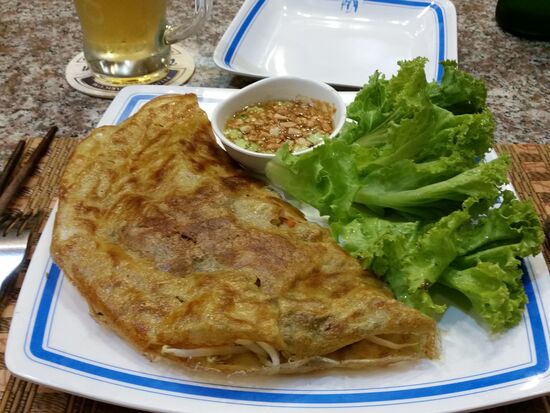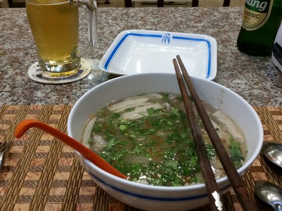 Das Lokal ist richtig schön, bequeme Sitzbänke alles hell und freundlich. Ich bestelle die klassische Rindfleischnudelsuppe und etwas dass auf dem Foto wie ein Omelett aussieht. Ich hoffe dass es die Pfannkuchen sind, wie ich sie in Saigon gegessen habe. Tatsächlich sind sie das und ich esse richtig lecker. Nur die Wurststreifen in der Suppe finde ich etwas irritierende. Dazu ist das ganze wieder einmal erstaunlich günstig. Mit einem großen Chang zahle ich insgesamt 200 B.