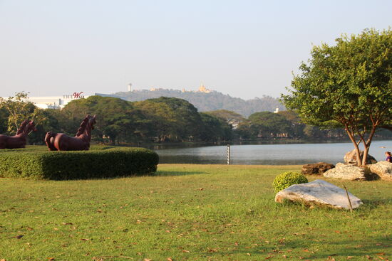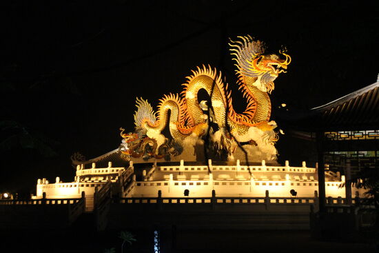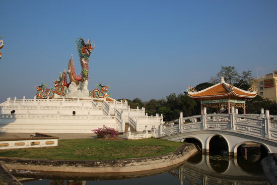 Ich erkläre, dass ich heute nicht herumgefahren werden will, sondern nur an den äußeren Punkt am See bei der Texco Shopping Mall. Die Chefin dolmetscht wieder. Ich frage wieder, was es kostet und er meint 100 B. Da werde ich etwas sauer, weil er jeden Tag mehr verlangt. Er hat mich irgendwie verstanden und korrigiert auf 80. Ok. Er setzt mich genau am Eingang zu dem Park ab, in dem der See liegt. Dann gibt er mir noch ein kleines Zettelchen mit vermutlich seinem Namen und seiner Telefonnummer. Ich stecke es ein. Es kann ja nichts schaden. Der Park ist von einem Zaun umgeben, in dem sich immer wieder einmal kleine schmale Eingangstüren befinden. Innen führt ein breiter Weg um den See, eingeteilt in Radwege und Fußgängerbereiche. An dem Punkt an dem ich mich befinde, quasi die Stirnseite des Parks befindet sich eine große Drachenstatue die mir ausgesprochen gut gefällt.