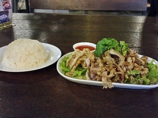 Neben dem Texco gibt es gleich noch einmal ein Sushi Restaurant das recht gut besucht ist. Ich entschließe mich aber, in ein Thairestaurant ein paar Meter weiter zu gehen. Hier sind schon ein paar Tische besetzt und was da an Essen herumsteht sieht ganz gut aus. Ich bekomme sogar eine englische Speisekarte. Ich nehme frittierten Tintenfisch mit Knoblauch, dazu den üblichen gekochten Reis. Das ganze sieht auf den Tellerchen eher schlicht aus, schmeckt aber gut. Es sind auch nicht die üblichen Tintenfischringe mit dicker Panade drum herum wie bei uns, sondern eher 2-3 kleine Tintenfische klein geschnitten, leicht meliert und dann frittiert. Gegen 19:30 beginnt ein Alleinunterhalter mit Gitarre Thaimusik zu spielen und bis 20:00 ist der Laden voll.
