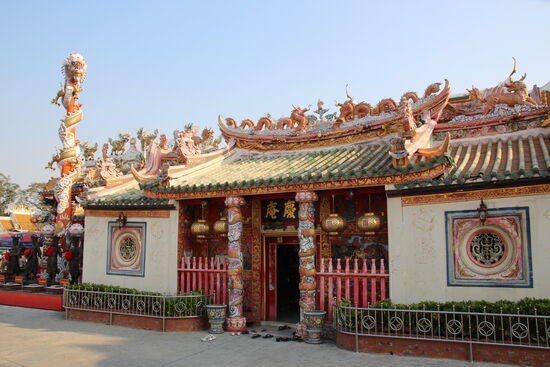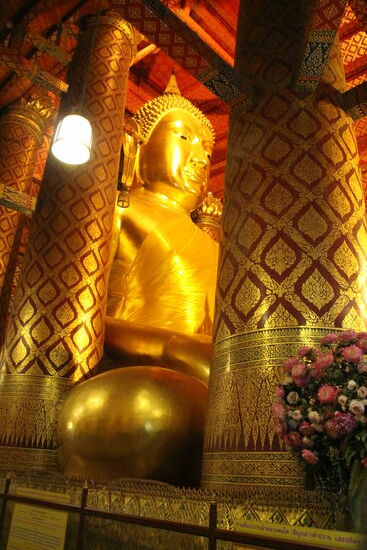 Um 15:15 bin ich an der Stelle am Fluss wo ich erwartet werde. Es dauert aber noch eine Weile bis es losgeht. Ich bin dann erst einmal der einzige Gast. Nachdem wir ein kurzes Stück den Fluss rauf gefahren sind bis zur nächsten Anlegestelle, wird das Schiff doch recht voll. Egal, ich habe ja meinen Platz in der ersten Reihe. Wir wenden und fahren dann im Uhrzeigersinn um Ayutthaya herum. Die ersten Eindrücke und Bilder sind schon sehr schön. Alleine dafür lohnt es sich, diese Fahrt einmal zu machen. Der erste Stopp toppt das aber noch. Wir halten an einem Tempel außerhalb der Insel, den ich nicht kenne und von dem ich auch nicht wüsste, wie man ohne Boot zu ihm kommt. 20 B Eintritt kostet der Wat Panan Choeng und beherbergt die angeblich älteste Antike Buddha Statue Thailands. Wenn man vor ihr in der Halle steht mag man das glauben. Es ist zwar noch kein Vergleich zu den 93 Metern die die neue Statue in Ang Thong hat, aber die steht ja auch im freien und ist außerdem erst ganz neu. Dieser Buddha dagegen soll aus dem Jahr 1344 sein.