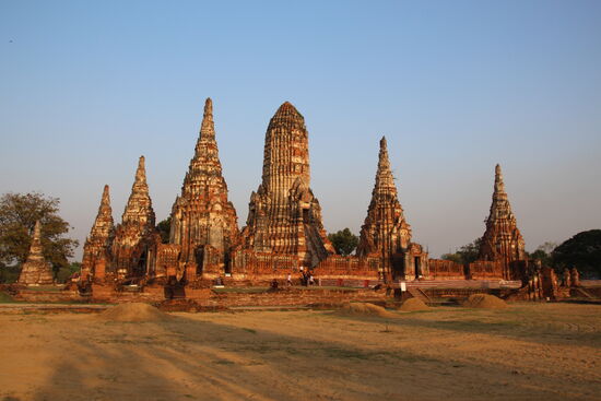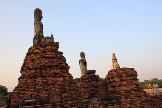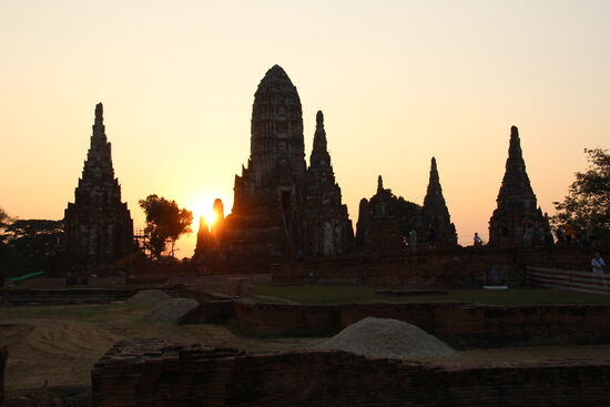 Der Dritte Halt erfolgte dann beim Wat Chaiwatthanaram. Hier haben wir 30 Minuten Aufenthalt gegenüber den anderen beiden Tempeln mit je 20 Minuten. Trotzdem schaffen es die Leute nicht, pünktlich wieder am Boot zu sein. Der beginnende Sonnenuntergang ist zu verlockend. Ich selbst bin in der Nähe vom Boot und dann der erste der auch einsteigt. Als wir mit 15 Minuten Verspätung dann endlich ablegen nickt der Bootsführer mit im Vorbeiklettern dankbar zu. Es ist 18:30 als wir an der Haltestelle ankommen, bei der die meisten eingestiegen sind. Ich steige ebenfalls hier aus. Damit spare ich mir das zurückfahren mit der Fähre.