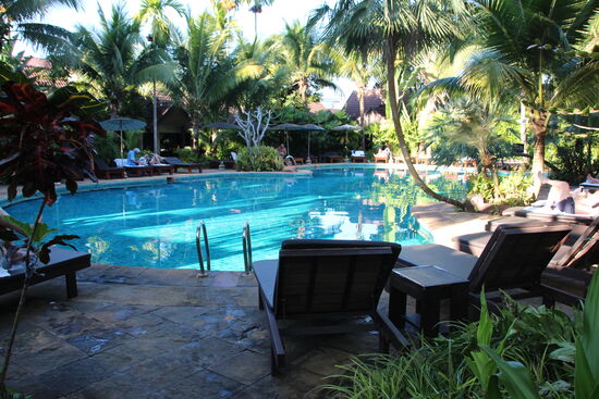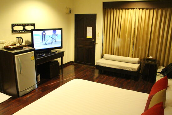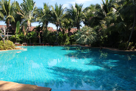 Der Flughafen Chiang Rai ist sehr klein, hat aber trotzdem richtige Anlegestege wie die großen Flughäfen. Das Gepäck ist flott da und ich mache mich auf die Suche nach einem Taxi. Das Schild „Meter Taxi“ ist ganz schön irreführend, denn auch hier muss man einen Voucher kaufen. Der kostet mich 180 B. Ich finde das völlig überteuert, aber die Dame wiederholt nur stoisch den Preis. Tja, da bleibt wieder einmal nichts anderes übrig, als in den sauren Apfel zu Beißen. Immerhin ist es dann doch ein ordentliche Strecke, die wir fahren. Leider gilt das auch für die Lage meines Hotels, dem Laluna. Es dürften schon so 2 Kilometer bis zum Nachtmarkt und damit dem Zentrum der Stadt sein. Das wäre ja noch halbwegs ok, wenn es sich nicht um eine absolut öde Strecke handeln würde, fast schon wie eine Landstraße. Es geht nur einmal rechts und einmal links, aber die Strecken dazwischen ziehen sich ewig. Dafür gehören der Hotelgarten und der Pool, zu den schönsten, die ich bisher hatte. Auch der Bungalow ist angenehm geräumig.