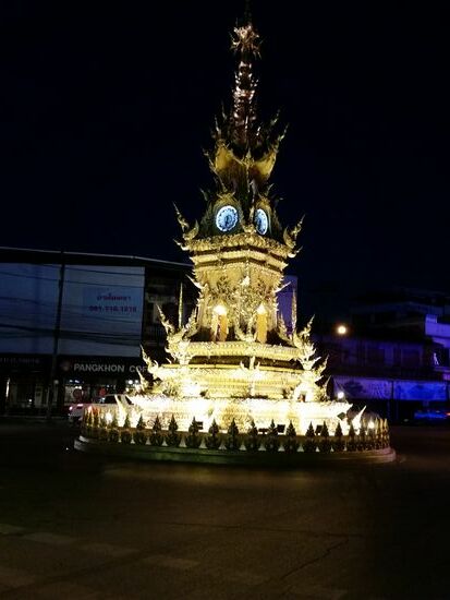 Zum Abendessen geht es natürlich auf den Nachtmarkt. Es gibt einen etwas längeren Weg außen herum, über die Hauptstraßen und eine etwas kürzere Abkürzung. Ich nehme den längeren und sehe so gleich noch etwas vom Ort, wie zB den recht hübschen (protzigen) Glockenturm und einen ganz interessanten Tempel.