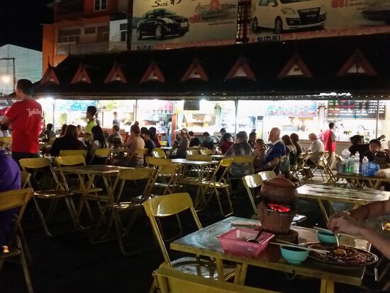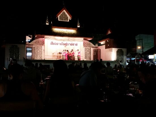 Ein bisschen muss ich suchen, bis ich den Nachtmarkt finde oder besser, das Restaurant, das sich selbst als „der Nachtmarkt“ ausgibt. Auf einem großen Platz befindet sich ein einziges großes Lokal mit Folklorebühne. „Das kann aber nicht der Nachtmarkt sein“ denke ich mir. Ich kenne ja asiatische Nachtmärkte. Siehe da, wenn man weiter läuft durch einen Nachtmarkt für Klamotten etc um ein paar Ecken, taucht der richtige Nachtmarkt auf. Es gibt jede Menge Stände, wobei einige das gleiche Angebot haben. Allerdings nur einen, der sich auf Phad Thai und ähnliche Nudelgerichte spezialisiert hat. So komme ich endlich zu meinem (richtig leckeren) Phad Thai. Obwohl der Nachtmarkt ziemlich groß ist, ist er voll. Es ist fast kein Tisch zu bekommen. Als ich mich irgendwann traue, mir ein weiteres Bier zu holen ist innerhalb der 2-3 Minuten mein Tisch abgeräumt und es werden zwei neue Gäste hingesetzt. Ich beschwere mich, dass das mein Platz ist, habe aber kein Problem damit, mit dazuzusetzen. Hauptsache, ich habe einen Sitzplatz. Der Angestellte bringt sie aber trotzdem weiter vor an einen anderen Tisch, der gerade leer geworden ist. Als Nachschlag habe ich mir noch panierte, frittierte Shrimps geholt.