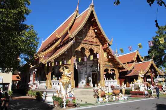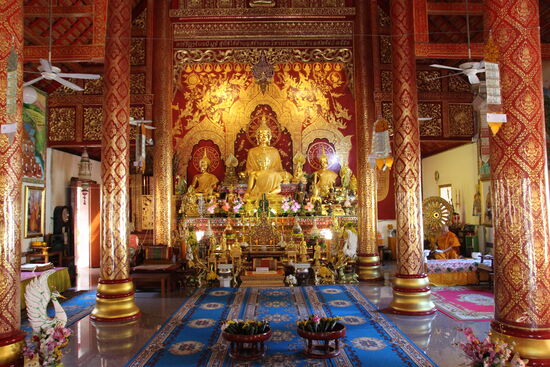 Wenn ich schon einmal wieder so weit nördlich bin, schaue ich mir auch gleich den Wat Bopparam an. Die verlangen als erster Tempel in Chiang Mai eine Art Eintritt von 20 B von Nichtthais. Das finde ich in Ordnung. Ich gebe meistens eh 20 B + als Spende für den Tempel, was aber die wenigsten tun. Interessanterweise habe ich das Gefühl, dass das gerade dazu führt, dass hier besonders viele Touristen unterwegs sind. Sei es, weil Rundreisen und Sightseeing-Touren ihn mit einbauen oder weil nur was taugt was etwas kostet, wie es so schön heißt. Der Bot des Tempels ist allerdings auch schön gestaltet.