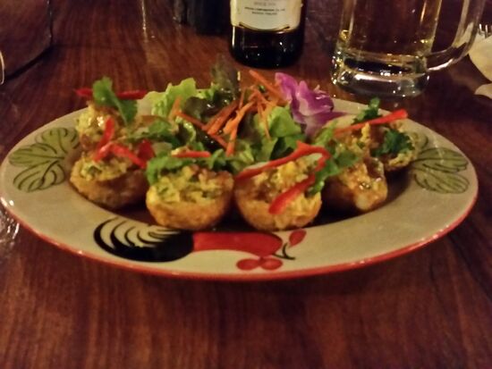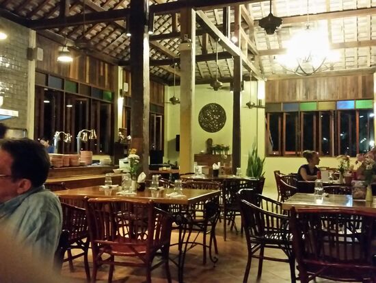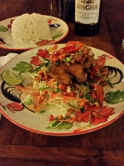 Zum Abend essen bin ich etwas unentschlossen. Gleich zwei hochpreisige Restaurants würden mich einmal reizen. Quasi gegenüber vom Hotel auf der anderen Seit vom Fluss liegt das „Dukes“. Hier reizt mich in erster Linie die Chowder, eine Cremesuppe aus Muscheln oder Shrimps die man nicht allzu oft bekommt und die ich liebe. Dann gibt es gleich neben der Bus Bar das River Market Restaurant, das von außen schon sehr schön ist und im Internet sehr gehoben ist. Gestern war hier geschlossene Gesellschaft und von außen hat man gesehen, dass echt die Post abgegangen ist. Also entschließe ich mich dafür. Auf der Speisekarte lassen sie sich über die Thailändische Kochkunst aus (es gibt auch eine angeschlossene Kochschule). Ich bestelle, auch um halbwegs im Kostenrahmen zu bleiben als Vorspeise irgendetwas, das wie Eier aussieht aber keine Ahnung und als Hauptgang einen Deep Fried Fish, dazu gekochten Reis und ein großes Bier. Zur Vorspeise kommt tatsächlich so etwas wie russische Eier auf Thai. Nicht schlecht, aber ich brauche keine 6 halben davon. Deshalb lasse ich zwei stehen. Der Fisch ist ok, aber absolut langweilig. Auch der „Salat“ dazu und die Art thailändische Salsa schmecken langweilig. Dafür zahle ich insgesamt 680 B. Ausnahmsweise zahle ich mit Kreditkarte.