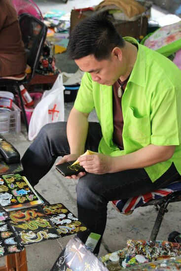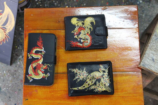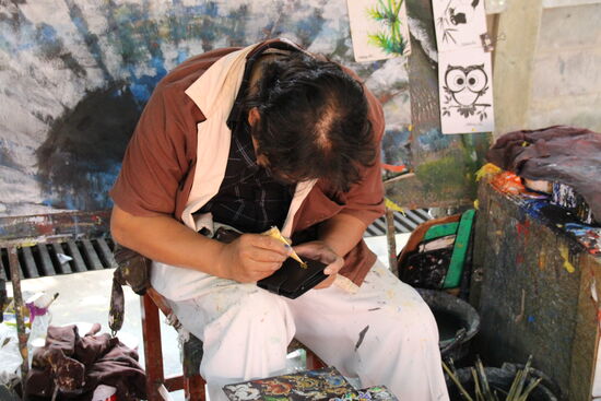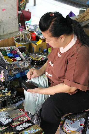 Ich frage die Chefin, wo ich meinen Geldbeutel bemalen lassen kann und sie zeigt den Weg zurück, meint „Umbrella, one Kilometer“. Also doch. Nachdem ich schon so weit gelaufen bin, schaue ich mir vorher den Tempel an den ich in kurzer Entfernung sehe. Danach drehe ich um, muss erst einmal ein paar Schulkinder grüßen in der Schule gegenüber vom Tempel, und laufe wieder zurück. Erst schaue ich in eine Schirmfabrikation. Da ist noch kein Betrieb. Dann noch einmal in das Handycraft Center. Da ist auch noch nichts los. Dafür erklärt mir ein Mann, dass ich vor zur Kreuzung muss, als ein anderer mit seinem Motorrad mit „Beiwagen“ ankommt und Gegenstände abzuladen. Der erklärt dann, dass er mich mit seinem Gefährt hinbringt. Vertrauenserweckend sieht die Konstruktion ja nicht aus, war wird schon. Tatsächlich fährt er mit direkt an der Kreuzung wo ich in den Ort eingebogen bin, in ein weiteres Handycraft Center, das noch größer ist und hier sitzen in einer Kolonnade die Maler und Malerinnen. Ich frage den ersten Maler in der Reihe, was das Bemalen eines Geldbeutels kostet und er meint „100B.“ Das ist weniger als ich dachte und ich glaube so viel wie ich auch vor 15 Jahren schon gezahlt habe. Mir ist unterwegs eingefallen, dass ich ja nicht nur den neuen Geldbeutel, den ich mir vorgestern gekauft habe, bemalen lassen kann, sondern auch den aktuellen. Und jetzt kommt mir die Idee, auch meine neue Handyhülle bemalen zu lassen. Ich will ihm alles drei geben, Aber er macht ein Zeichen, dass der Nebendran auch etwas verdienen möchte. Und so verteile ich meine Aufträge an drei Maler während die vierte in meinem Rücken meint, ich solle auch meinen Rucksack bemalen lassen, aber das will ich nicht und so gibt es keine weiteren Diskussionen. Ich denke, dass ich sowieso ein Glücksfall für die bin, weil direkt nach mir noch zwei Reisebusse angekommen sind, für die ich gleich Werbung war. Und jemand, der gleich drei Sachen bemalen lässt kommt wohl auch nicht so oft vor. Für mich sind das aber ganz persönliche Mitbringsel. Eine weitere Dose aus Thailand werde ich mir voraussichtlich nicht mitbringen.