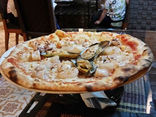 Nachdem mir schon seit zwei Tagen die Pizza im Kopf rumgeistert ist klar, dass ich meinen Vorsatz, vorläufig nicht mehr in ein teures ausländisches Lokal zu gehen nicht wirklich lange halte und heute Abend ins Girasole gehe. Dort angekommen bin ich mir erst einmal gar nicht sicher, weil es ziemlich leer aussieht. Dann gehe ich doch rein und bin regelrecht begeistert. Die Bedienung ist schnell und freundlich, die Kürbiscremesuppe für unter 100 B sehr lecker, die Meeresfrüchtepizza fantastisch und richtig groß. Dünner Boden, knuspriger Rand und fantastisch belegt. Dennoch obwohl ich satt bin noch ein Creme Caramel als Nachtisch. Dazu zwei kleine Gläser gezapftes Bier und ein Espresso für rund 620 B. Das ist nicht billig, aber absolut angemessen.