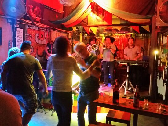 Ich stelle im Hotel kurz meinen Rucksack ab und mache mich auf den Weg zur Zone Zoe, einem Platz in der Altstadt, an dem sich die Traveller Ausgehszene von Chiang Mai angesiedelt hat. Hier gibt es mehrere Discotheken, Kneipen etc in denen sich die jungen Hippen Traveller treffen. Nicht meins bis auf die Roots Reggae Bar, in der ich bei meinem letzten Aufenthalt in Chiang Mai schon war. Da war dieses Gebiet gerade noch ganz neu. Schon damals gab es hier drin gute Life Musik und das ist auch so geblieben. Spätestens als die nächste Band um 10:30 beginnt, geht hier die Party ab. Die Croissants, wie sie sich nennen sind relativ junge Thais und erstaunlich gut. Wie gesagt behagt mir hier das Publikum zumindest teilweise nicht besonders.