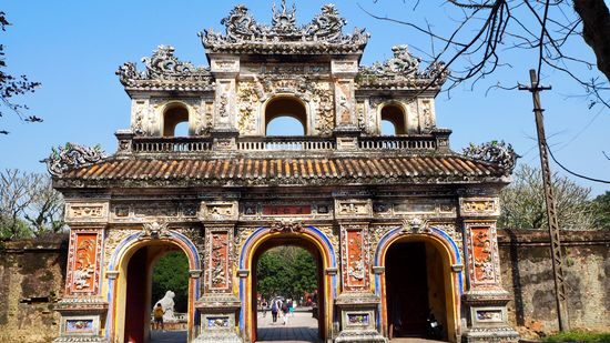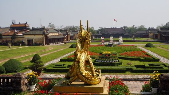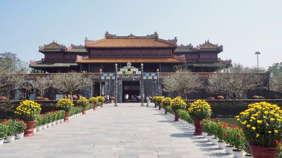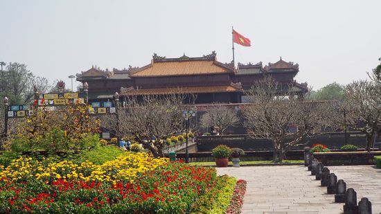 Die anmutende Stadt Hue war einst die Hauptstadt der Nguyen-Herrscher. Die meisten Sehenswürdigkeiten, darunter auch die Kaiserstadt liegen innerhalb der Mauern der Zitadelle. Die mächtige Befestigungsanlage besteht aus 2m dicken, 10 km langen Mauern und einem 30 m breiten und 4 m tiefe Burggraben und 10 Toren.