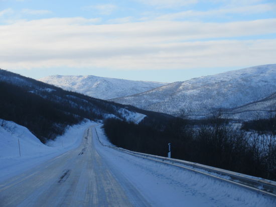 Statt die direkte Route von Utsjoki in Richtung Süden entlang der E75 zu nehmen, entschlossen wir uns einen Bogen über den Ort Karigasniemi zu nehmen. Die Landstraße 970 führt hier immer entlang dem Fluss Tenojoki und der Grenze zu Norwegen zu unserer rechten und dem Kevo luonnonpuisto (Naturpark) zu unserer linken. Die Landschaft hier ist von seichten Hügeln geprägt, was unsere Fahrt sehr abwechslungsreich und kurzweilig machte. Nach gut 100km erreichten wir den Hauptort der Region Karigasniemi mit seinen 500 Einwohnern und bogen hier nach links in Richtung Inari ab. Nach weiteren knapp 150km und einem letzten Einkauf für die letzten Tage erreichten wir schließlich den Ort Njurkulahti.