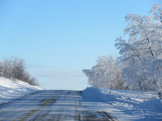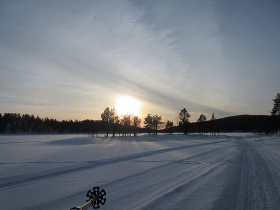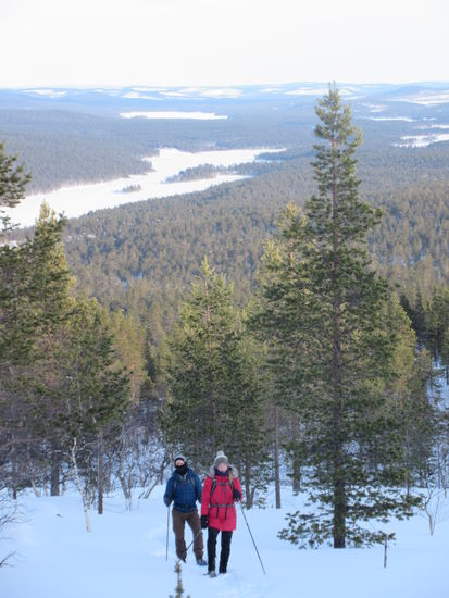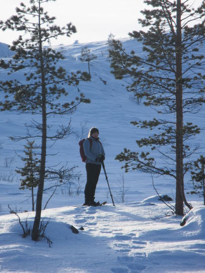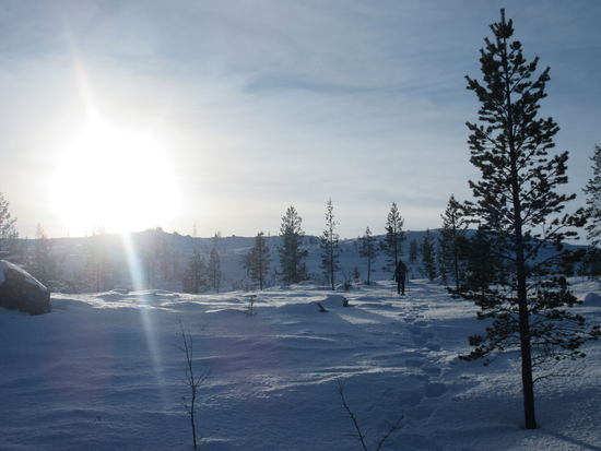 Wir folgten zuerst ca. fünf Kilometer dem Fluss Lemmenjoki auf dem dicken Eis. Da die Oberfläche des zugefrorenen Flusses eine perfekte Ebene bildete, konnte der Wind den Schnee leicht wegtragen, weshalb sich nur eine leichte, wenige Zentimeter dicke Schneeschicht auf dem Eis hielt. Hier konnten wir ohne Probleme die Schneeschuhe im Rucksack lassen. Was für eine Wohltat! Nicht nur kommt man auf diese Weise um ein Vielfaches schneller voran, auch fällt einem das Gehen mit einem Mal so leicht, dass man das Gefühl hat, auf diese Weise locker 30-40 Kilometer an einem Tag abreißen zu können (ob das letztlich tatsächlich so ist, steht auf einem anderen Blatt). Um auf den Berg zu kommen, mussten wir jedoch nach einiger Zeit nach links abbiegen. Kaum am Ufer angekommen zeigten sich die Schneeverhältnisse jedoch von einer ganz anderen Seite. Denn zwischen den dicht stehenden Kiefern sammelten sich Schneewehen, die teilweise bis weit über Beckenhöhe reichten. Ohne Schneeschuhe wäre man hier hoffnungslos verloren. Wir wandten also erneut die Gänsemarschtaktik, wobei der vorderste Läufer bei Weitem den größten Kraftaufwand leisten musste. Die Mischung aus dem extremen Tiefschnee und dem stetig ansteigenden Geländer sorgte dafür, dass wir alle an unsere körperlichen Belastungsgrenzen stießen. Gut, dass es an diesem Tag nicht so kalt war, wie in den Tagen zuvor. Bei -25°C wäre die Tour zu einer wahren Qual geworden.
