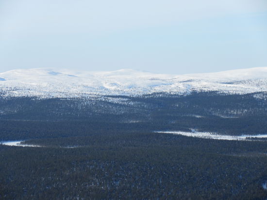 Nach einer gefühlten Ewigkeit, in der wir maximal einen Kilometer Wegstrecke hinter uns gebracht hatten, lichtete sich allmählich aufgrund der zunehmenden Höhe der Wald. Jetzt hatte der Wind auch wieder mehr Angriffsfläche, verblies die Schneedecke und wir hatten wieder leichteres Spiel. Die letzten paar Hundert Meter auf den Gipfel brachten wir schnell hinter uns. Oben angekommen genossen wir den Blick über die beeindruckende Landschaft. Leider war der Wald aufgrund der milderen Temperaturen nun nicht mehr so vereist. Das nahm der Szenerie doch einiges von ihrem Zauber, den wir in den vergangenen Tagen so genossen hatten. Vom Gipfel des Joenkielinen konnten wir über weite Teile des Lemmenjoki-Nationalparks und in der Ferne sogar bis nach Norwegen blicken. Eine mehrtägige Tour quer durch den Nationalpark im Sommer wäre sicherlich auch eine tolle Erfahrung.