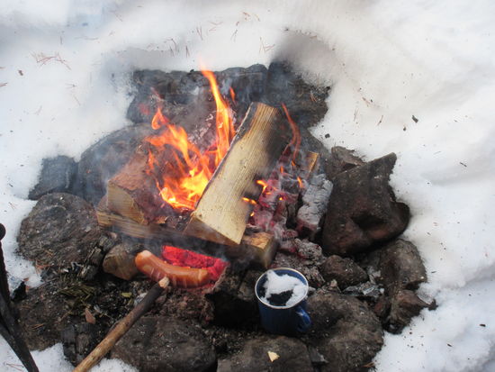 Nach einiger Zeit begann der Wind uns trotz der milderen Temperaturen etwas zuzusetzen, sodass wir den Abstieg begannen. Am Fuß des Berges machten wir noch einmal an einem laavu Rast, um über dem offenen Feuernoch gegrillte Würstchen und juustoleipä ("Käsebrot", der etwa wie Grillkäse schmeckt) zu uns zu nehmen. Diese Art der Rast ist typisch Finnisch und für mich persönlich ist sie einer der vielen Aspekte, die ich am finnischen Lebensstil so schätze. Eine Auszeit in der Natur zu nehmen, still schweigend vor einem Feuer zu sitzen und die Gedanken fliegen zu lassen. Die innere Ruhe, die ich in einem solchen Moment empfinde, ist mit nichts zu vergleichen.
