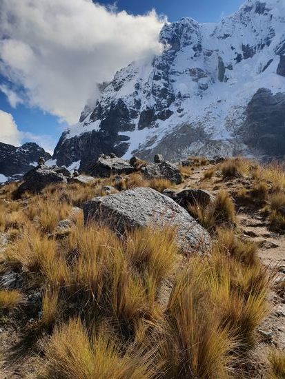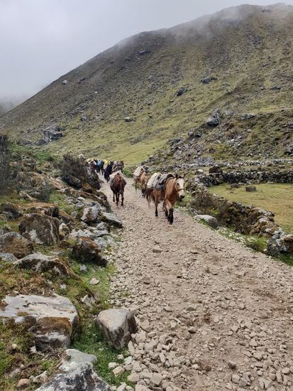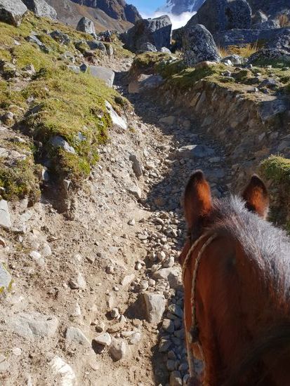 Tag 2 sollte mit dem Aufstieg zum Salkantaypass beginnen. 800 Höhenmeter von 3850m auf 4650m. Sowohl Pferd, als auch Mensch kamen ins Schwitzen und waren ganz schön aus der Puste. Einige nahmen sich ein Pferd für den Aufstieg. Einer fiel leider vom Pferd und brach sich 4 Rippen, was für ihn natürlich das Ende des Trekkings bedeutete. Zum Glück ist er auf dem Weg gelandet. Man mag sich gar nicht ausmalen, was passiert wäre, wenn er 50cm daneben den Abhang hinab gestürzt wäre. Man durfte auch nicht darüber nachdenken, was passieren würde, wenn das Pferd sich einmal vertritt, denn die Pferde liebten es, an der Seite des Abgrundes zu laufen und der Weg war mit lauter Geröll wahrlich nicht einfach. Aber da die Pferde den Weg täglich mit dem Gepäck der Gruppen alleine laufen, vertraute ich meinem Pferd. Nach meinem Unfall 2004 mit meinem Pony allerings keine leichte Sache.
