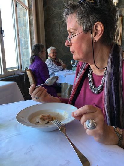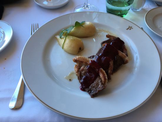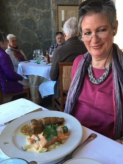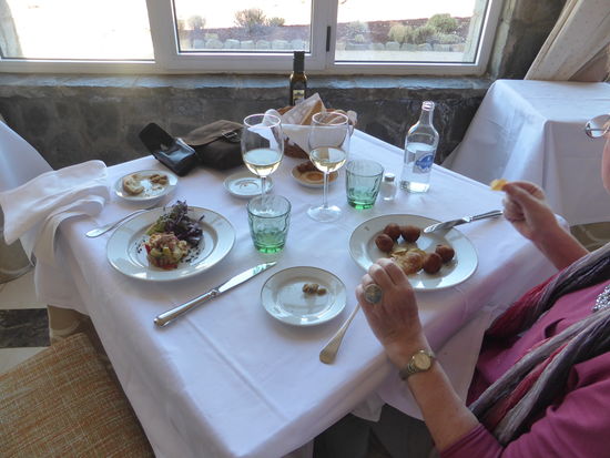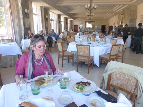 Im Parador nehmen wir dann das Lunchmenu zu 24€ und können je einen halben Starter, ein Maincourse und ein Dessert wählen. Dazu gibt es ein Glas Wein, wie sich nachher herausstellt auch das Wasser. U: kanarische Kroketten, Iberoschwein und Coffeecustard ; H: Gemüse mit Thunbelly, magret de canard und Schoko-Käsetorte. (Ein Riesenstück, wobei mir etwas mehr Ente fast lieber gewesen wäre) Die Rechnung beläuft sich auf 48€, aber als die KK-Abrchnung steht 44.85€ drauf (zu Hause stellt sich heraus, dass man die Rechnung gesplittet hat – aus welchen Gründen auch immer)