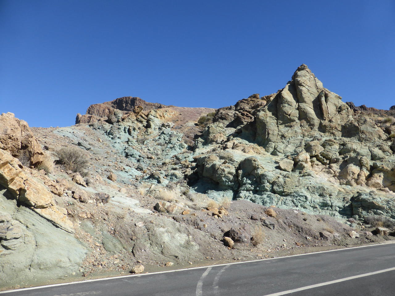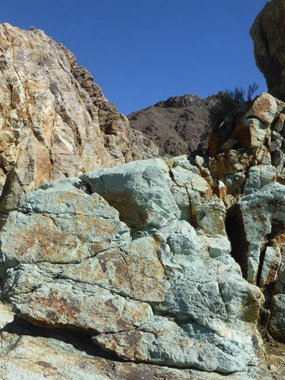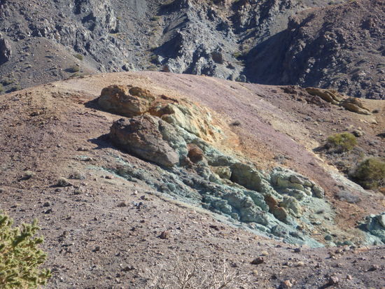 Auf dem Rückweg zum Parkplatz, an dem unser Auto nunmehr das einzige ist, bewundern wir noch das grünliche Gestein.