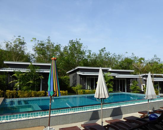 Am späteren Nachmittag kamen wir in unserem für 3 Nächte reservierten Resort an. Das Herbal liegt abseits, direkt am Waldrand des Nationalparkes. Zu diesem schönen Resort mit nur acht Bungalows in einem gepflegten Garten fährt man durch ursprüngliche Dörfer. Hier müssen viele im Transportwesen arbeiten, denn da stehen immer wieder Taxis, Songthaews und sogar ein großer Bus vor der Tür der kleinen Häuser. Sonst ist da nichts los, außer ein paar Hähne stolzieren auf der Straße und die freundlich wirkenden Hunden machen Platz, wenn wir mit unserem Moped andüsen und am Abend spielen die Boys Fußball oder so was ähnliches!