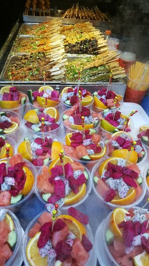 Wir schlendern durch die Gasse und schauen was alles angeboten wird: hier ein Buffet zur Selbstbedienung