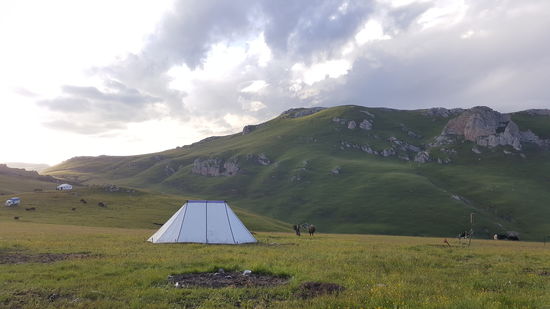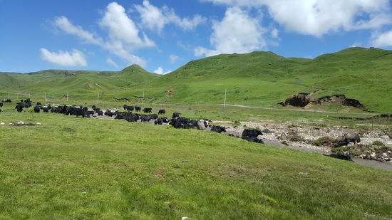 Überall sind Yaks. Wir sehen in weiterer Ferne noch mehr Zelte. Einige haben sogar ein Auto davorstehen. Und überall kommt Qualm aus den Zelten