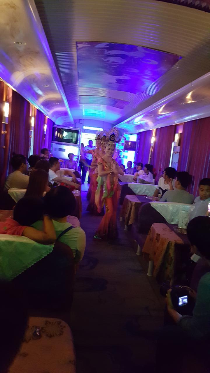 In diesem Zug gibt es auch ein schickes Restaurant mit gutem Essen und sogar Rotwein. Es gab sogar eine Tanzvorführung von 3 Damen in schicken Glitzerkostümen